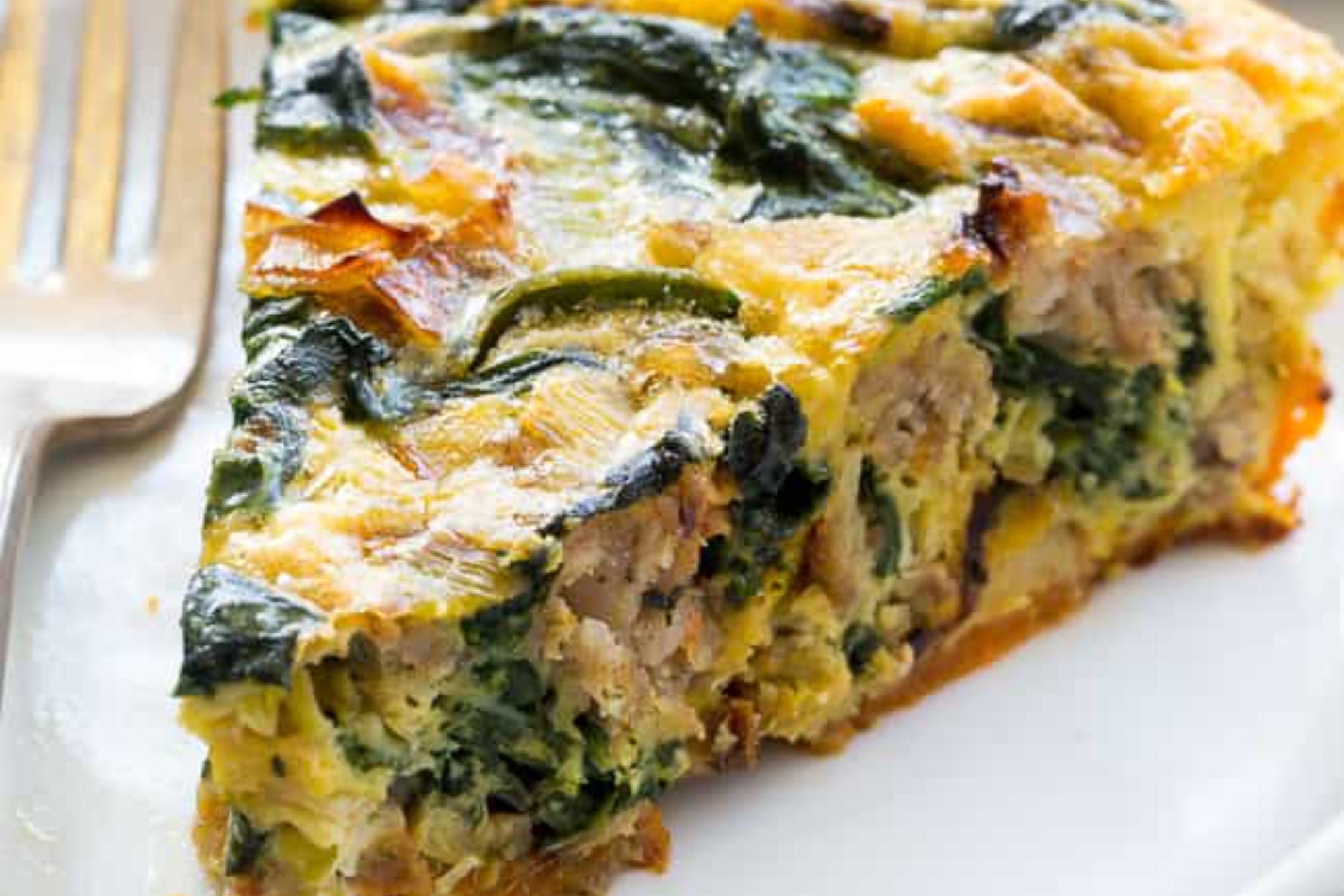 Our savory, delicious spinach quiche is a stand alone meal. Contains cheese & veggies (meat opt'..
